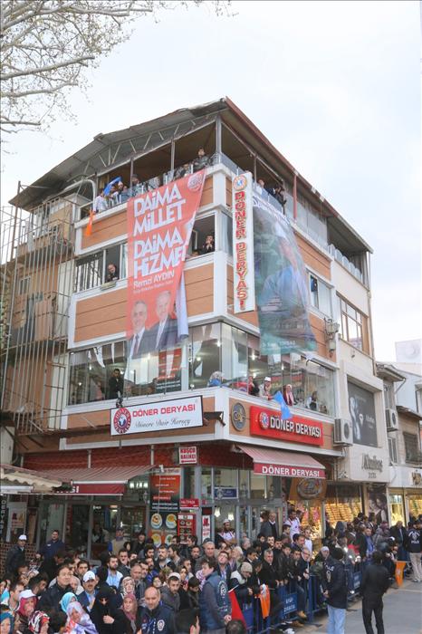 Eyüp Belediye Başkanımız İsmail Kavuncu, Eyüp Belediye Başkan Adayımuz Remzi Aydın ve İstanbul Büyükşehir Belediye Başkanı Kadir Topbaş’ın selamlama konuşmalarının ardından kürsüye çıkan Başbakan Recep Tayyip Erdoğan’a Eyüplüler sevgi tezahüratlarında bulundular. Meydanı dolduran binlerce kişi arasına giremeyenler, çevredeki dükkanların camlarından, teraslarından, çevredeki ağaçlardan, camiinin duvarlarına tırmanarak Başbakan’a selam verdiler. Eyüp’teki sevgi seline teşekkür ederek, selamlar vererek seçim otobüsüyle Meydan’a gelen Başbakan, yerel seçimlerde Eyüp’ten büyük bir zafer beklediğini söyledi. Başbakan Eyüp’teki mitinginde şunları söyledi: